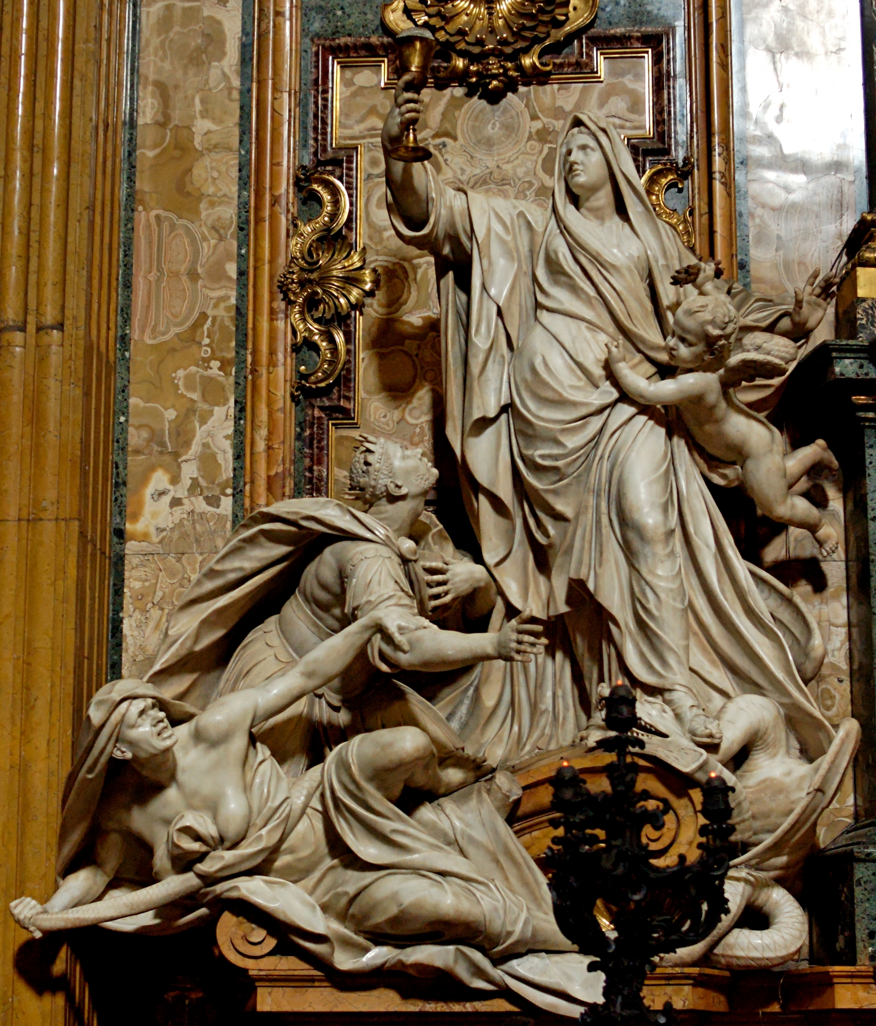 În loc de a încerca să definim în cuvinte „puterea temporală” a papei, ne vom întoarce la mormântul unde este înmormântat primul superior general al ordinului catolic din care papa Francisc face parte, pentru a vedea cum este acest concept ilustrat. În articolul „Vizita papei și Biblia de la Blaj” am discutat despre statuia de la mormântul lui Ignațiu de Loyola care poartă numele „Triumful Credinței asupra ereziei”, emblematică pentru pretenția de succesiune apostolică a pontifului roman. Să vedem acum ce are de spus cealaltă statuie, „Triumful Credinței asupra idolatriei” (vezi foto), cu privire la puterea temporală asumată de liderul de la Vatican.